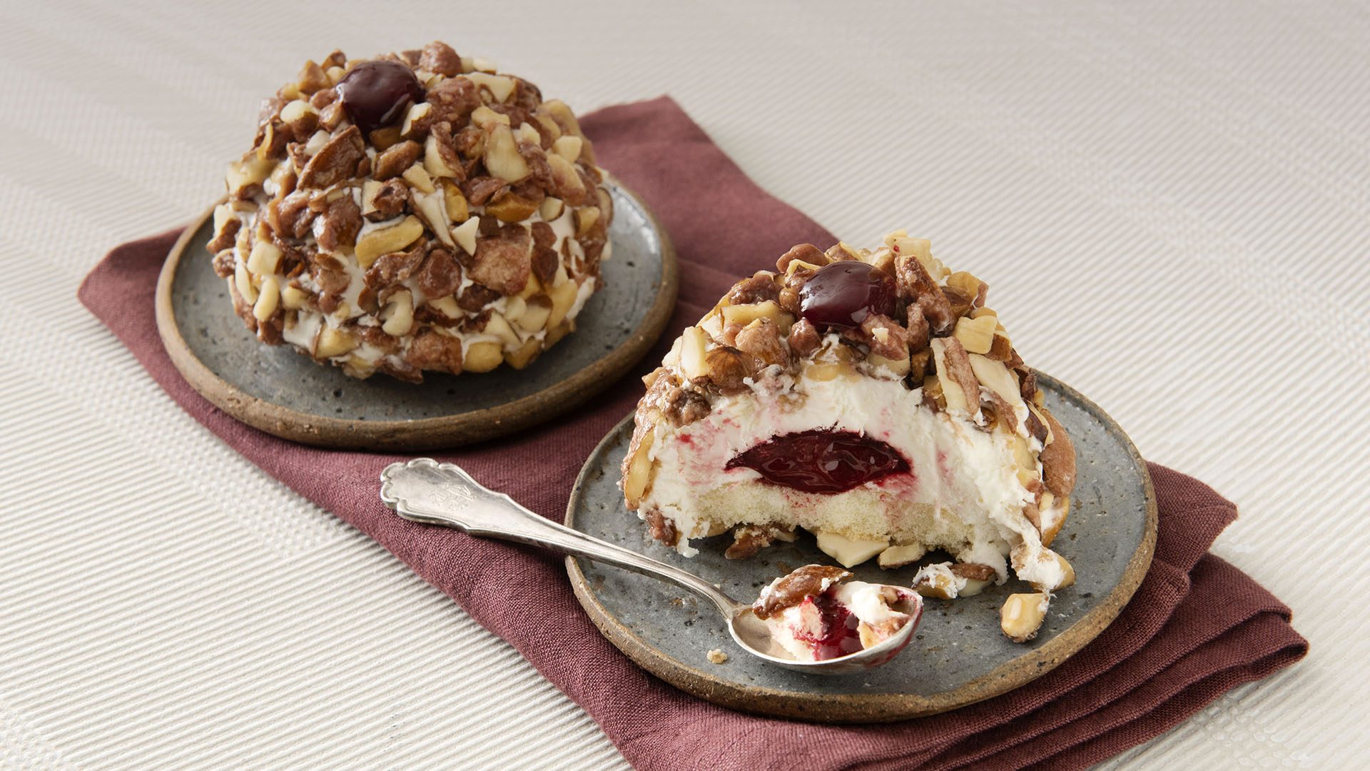 Semifreddo con crema al gusto vaniglia, cuore morbido all'amarena, decorato con mandorle caramellizzate