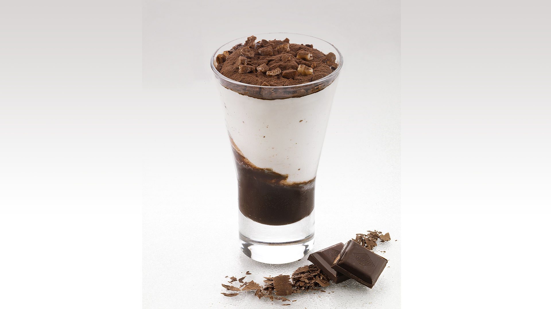 Semifreddo allo zabaione e gelato al cioccolato, decorato con granella di nocciole e cacao