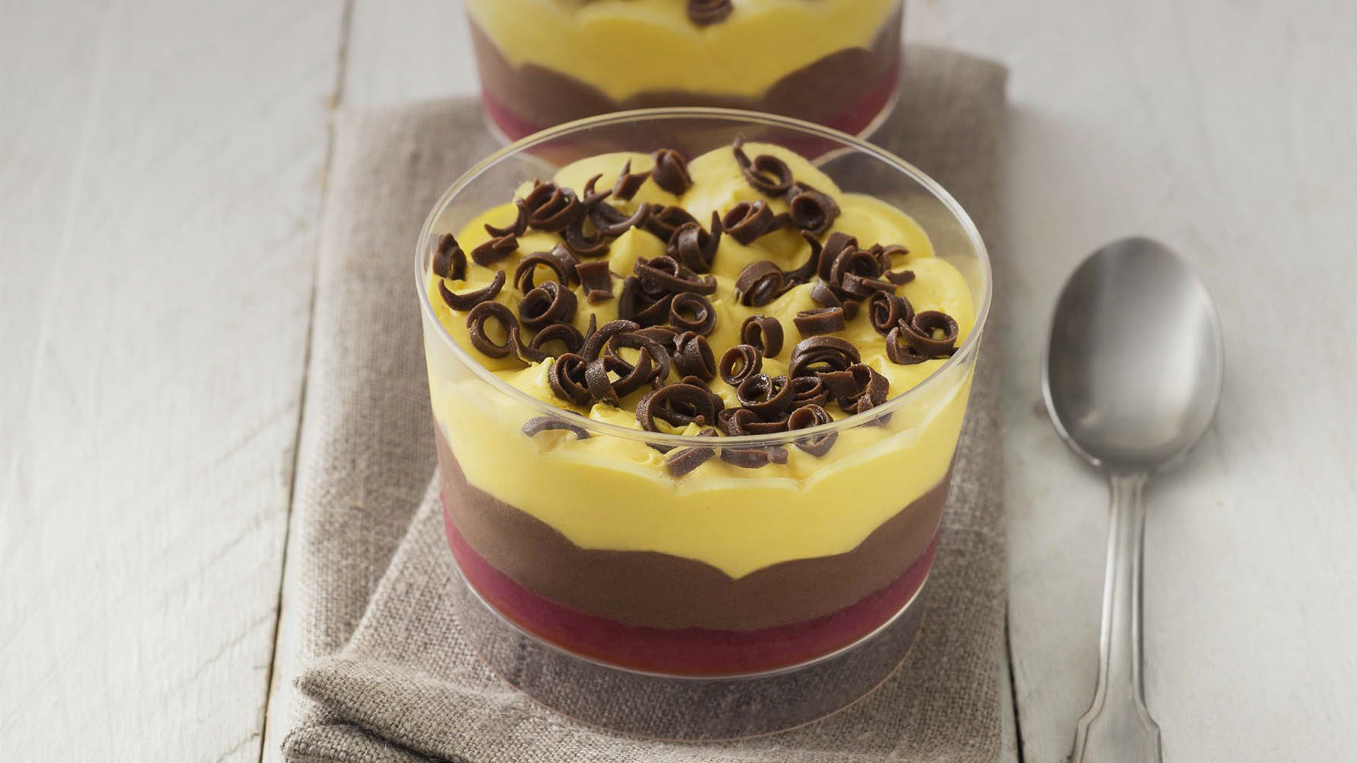 Pan di Spagna con inzuppitura al gusto Alchermes, semifreddo al cioccolato e zabaione e riccioli di cioccolato
